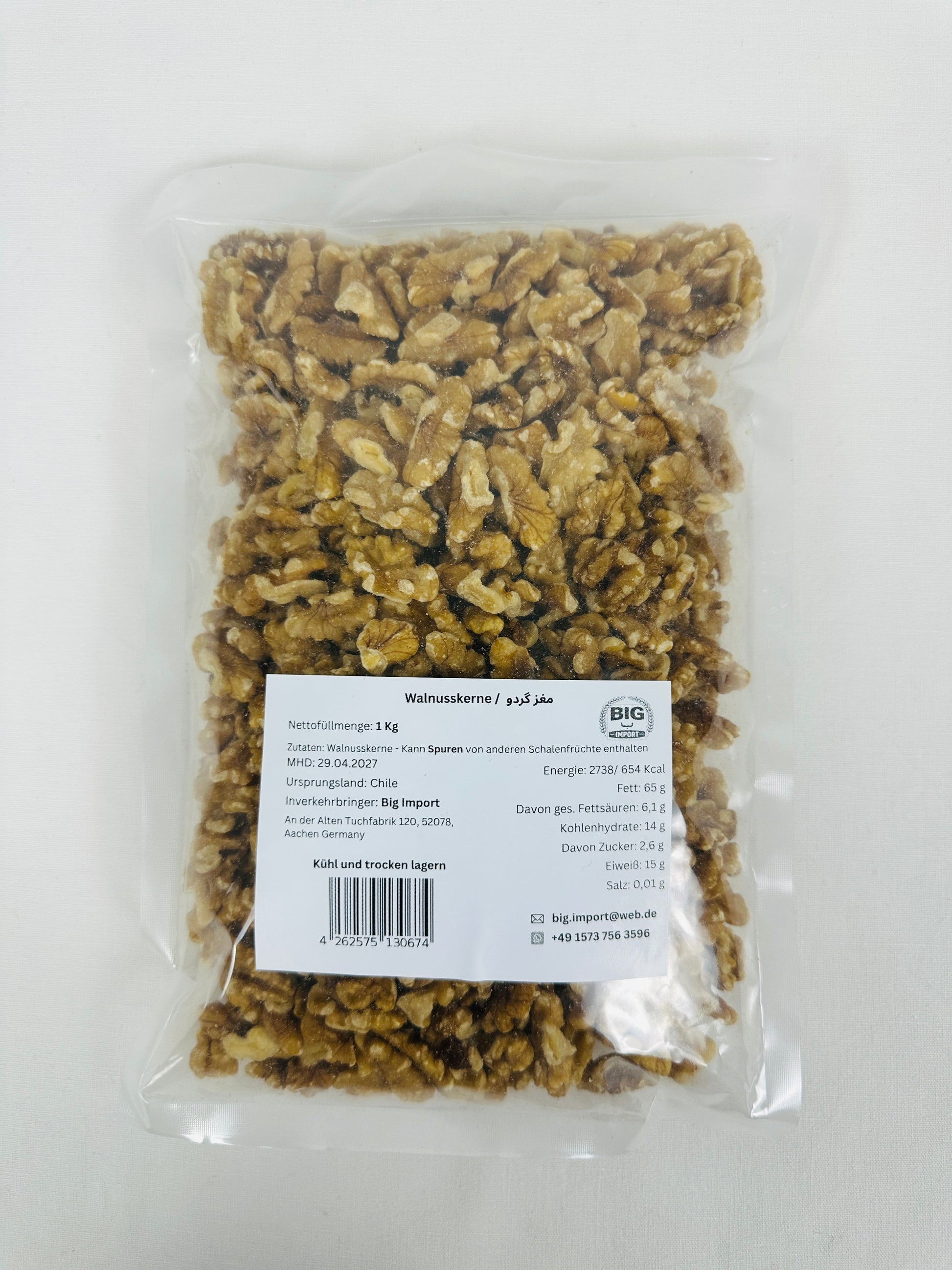 Walnusskerne sind reich an gesunden ungesättigten Fettsäuren, pflanzlichem Eiweiß, Ballaststoffen sowie wichtigen Vitaminen und Mineralstoffen. Sie eignen sich ideal als gesunder Snack, zum Backen, Kochen oder als Zutat für Müsli, Salate, Desserts und zahlreiche warme und kalte Gerichte.